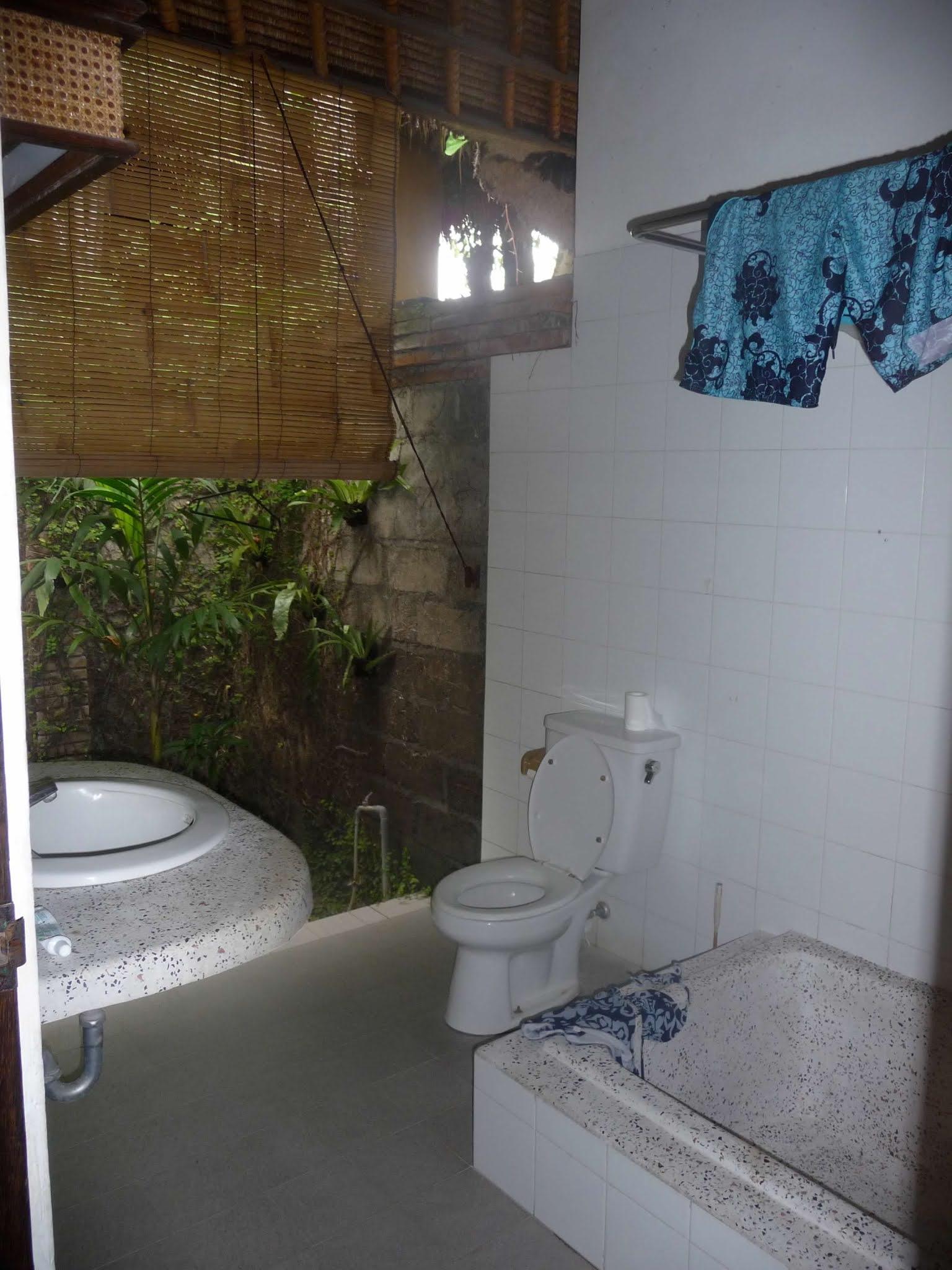 My favourite part is the bathroom. It is out towards the back of the villa. It has three walls, but no outside wall. The back of the room is open to the outside! I hope the pictures can capture how it looks. It also has a nice deep bath tub which I am going to try to take a bath in this week some time! An outside bath just like Heidi! (Heidi my friend, not the little Swiss girl from the book…). Anyway, the bathroom is super cool.