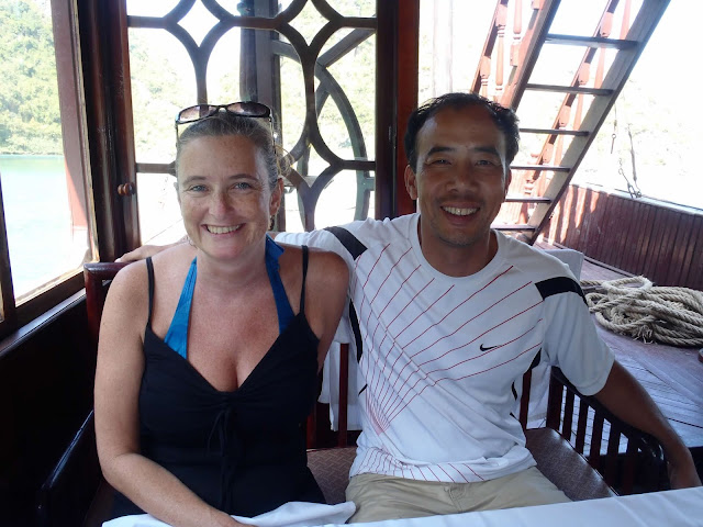 As we waited for the day boat I just had a little lay down on the bench on the upper deck and enjoyed the view. When the day boat arrived it picked up Steve, me, our tour guide, and the four Aussies from the bus from yesterday (who were staying on a different big boat). Thankfully the girl was not feeling sick anymore! We sat up on the top deck in the sun and drove through Halong Bay about one and a half hours to reach our kayaking area.
